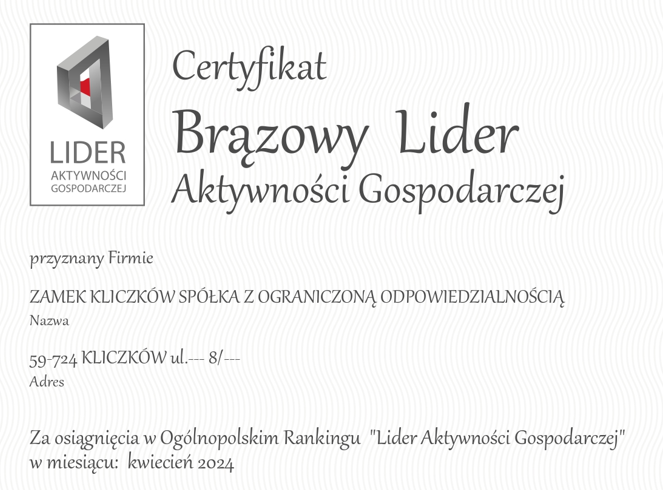 Certyfikat Brązowy Lider Aktywności Gospodarczej dla Zamku Kliczków