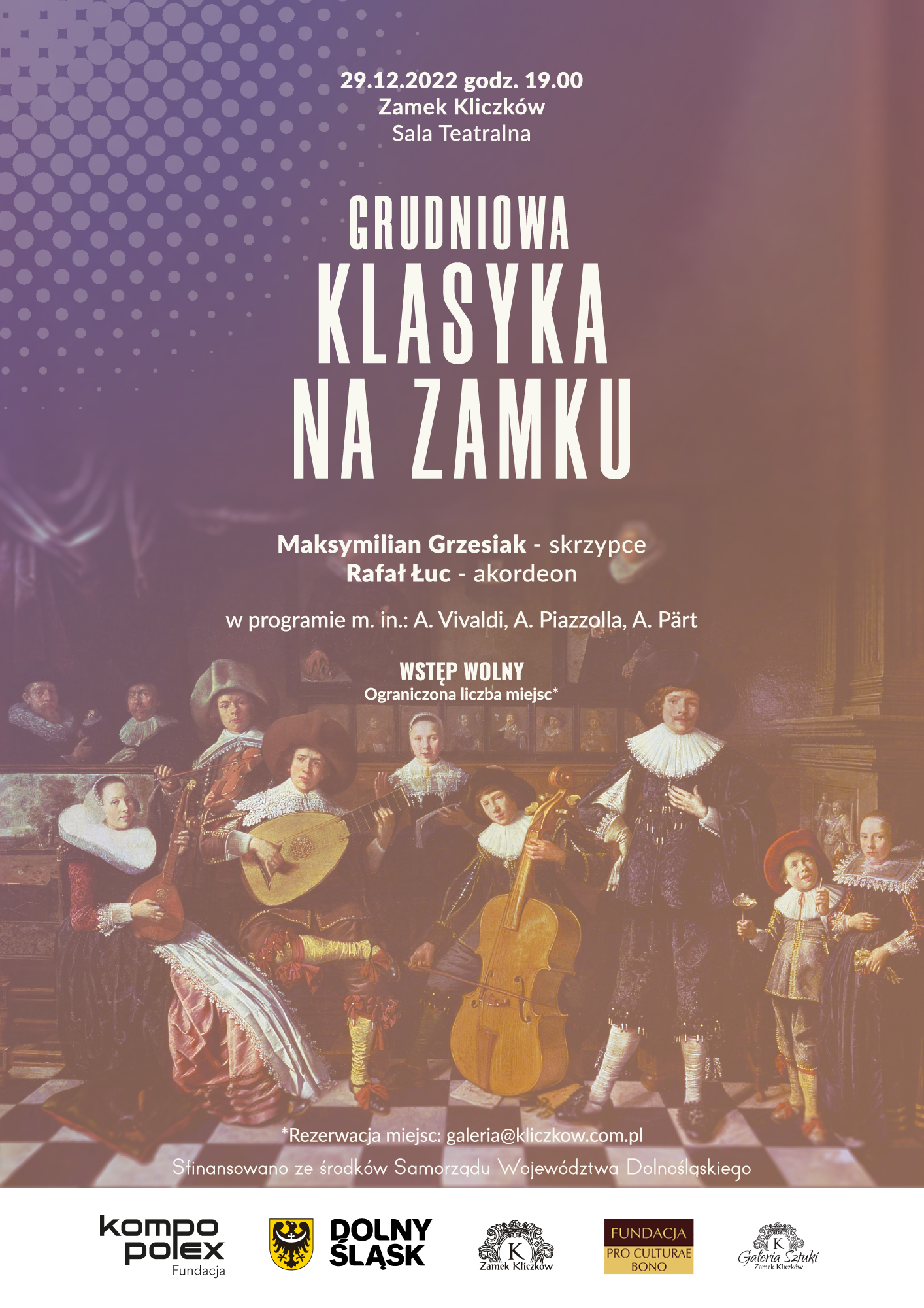 Grudniowa Klasyka na Zamku to wyjątkowy koncert na skrzypce i akordeon. W programie m.in. A.Vivaldi, A.Piazzolla, A.Part. Zapraszamy na kulturalne zakończenie roku w Zamku Kliczków.
