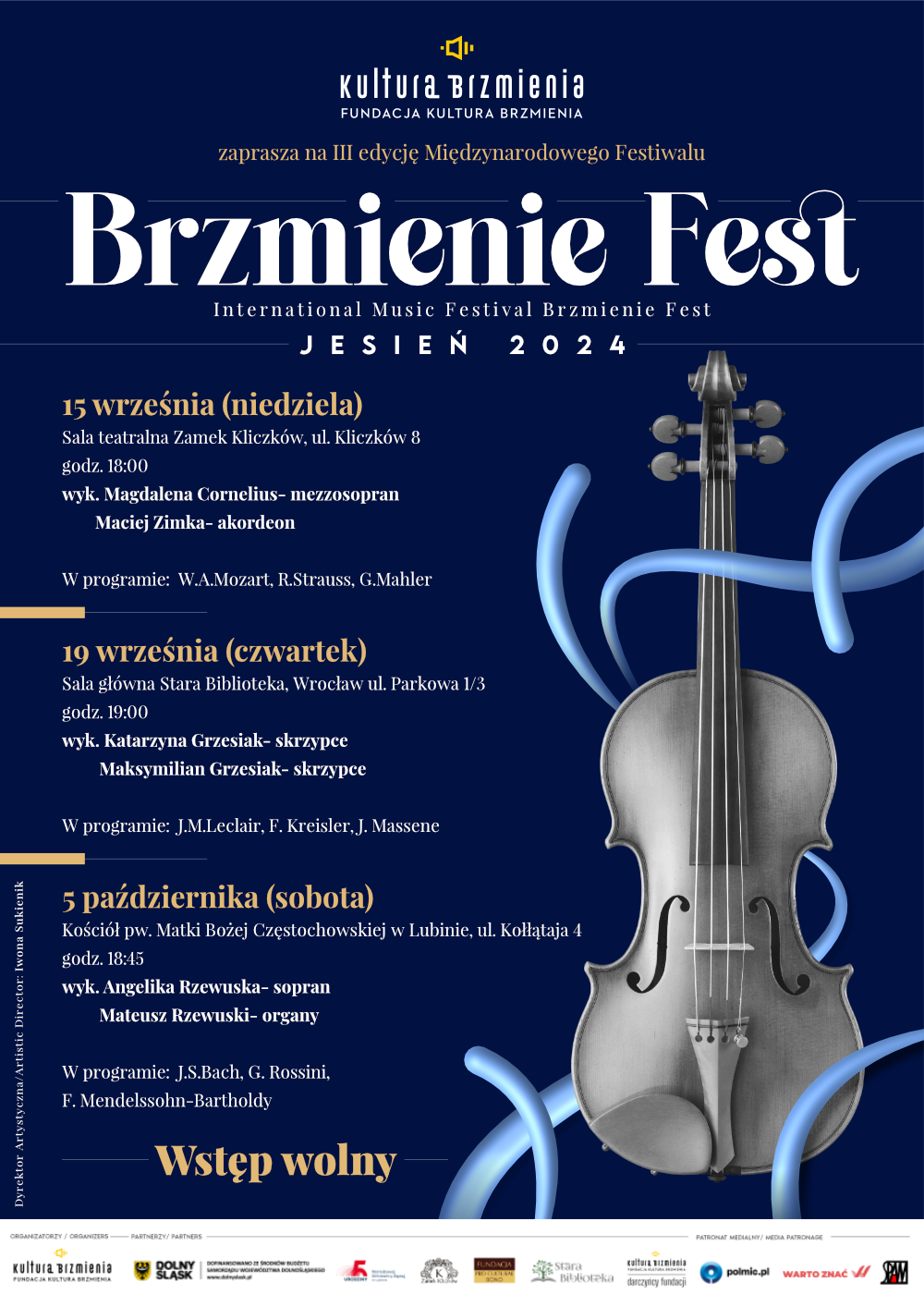Festiwal to wyjątkowe wydarzenie artystyczne, które gości znakomitych muzyków i zespoły, prezentujące szeroki repertuar muzyczny od klasyki po współczesne interpretacje. Kolejne koncerty odbędą się 19 września w Starej Bibliotece we Wrocławiu, gdzie na skrzypcach zagrają Katarzyna i Maksymilian Grzesiak, wykonując dzieła J.M. Leclaira, F. Kreislera i J. Massene’a, oraz 5 października w Kościele pw. Matki Bożej Częstochowskiej w Lubinie, gdzie wystąpi sopranistka Angelika Rzewuska z organistą Mateuszem Rzewuskim, prezentując utwory J.S. Bacha, G. Rossiniego i F. Mendelssohna-Bartoldy’ego. Serdecznie zapraszamy wszystkich miłośników muzyki do uczestnictwa w tym wyjątkowym festiwalu muzyki kameralnej.