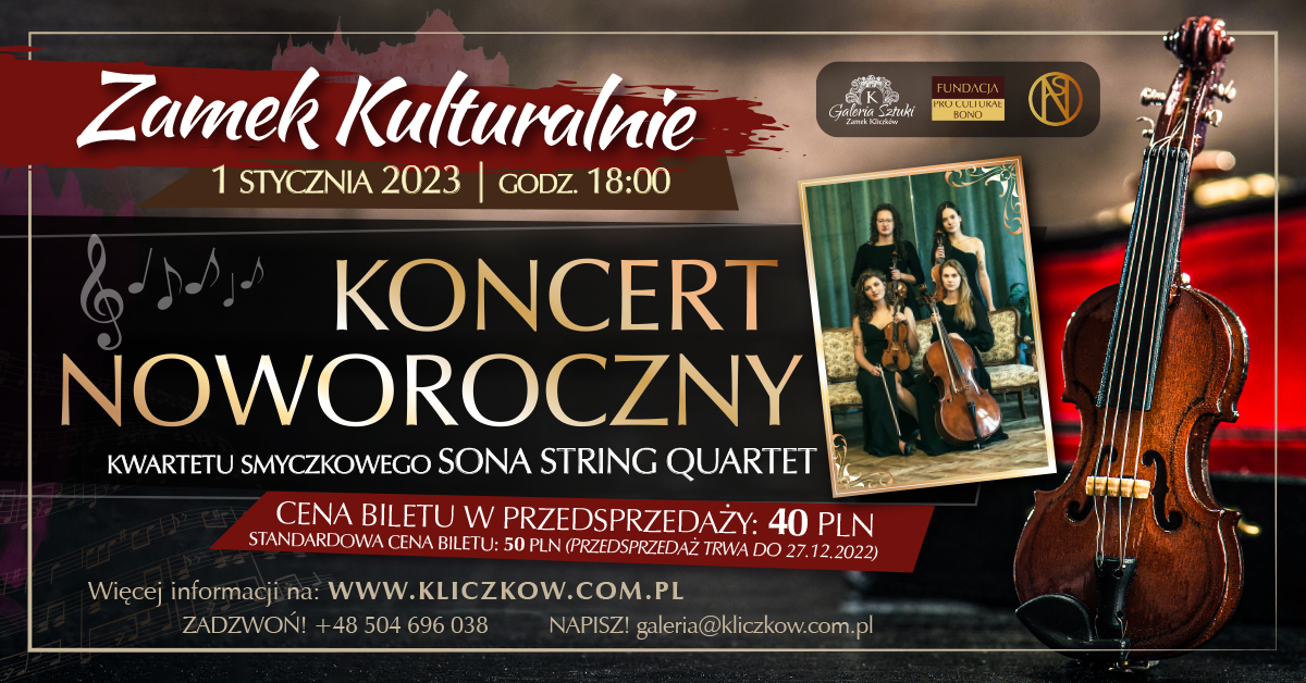 Fundacja Pro Culturae Bono serdecznie zaprasza do Zamku Kliczków na Koncert Noworoczny Kwartetu Smyczkowego Sona String Quartet.