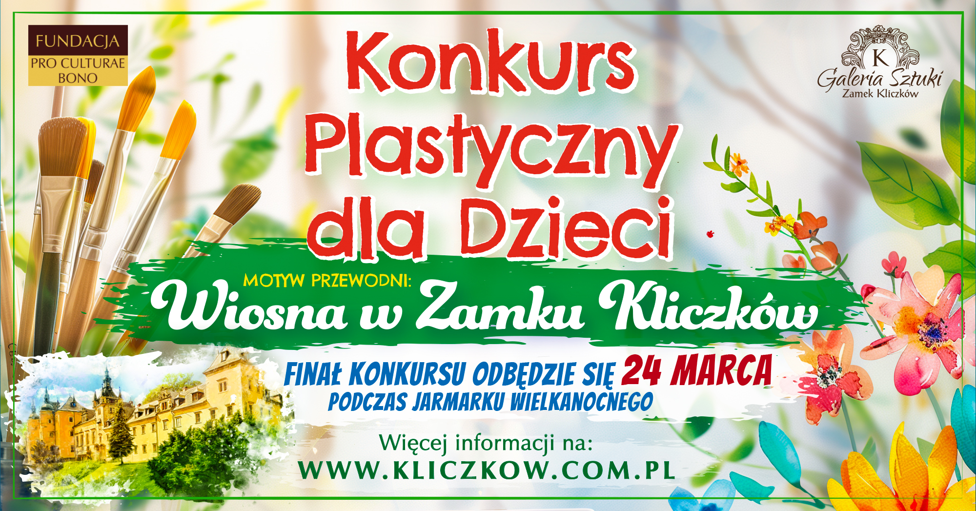 Zamek Kliczków oraz Fundacja Pro Culturae Bono serdecznie zaprasza do udziału w Konkursie plastycznym dla Dzieci pod tytułem: Wiosna w Zamku Kliczków. Zbieranie prac i rozdawanie nagród odbędzie się przed Spektaklem Wielkanocnym w dniu 24.04.2023.