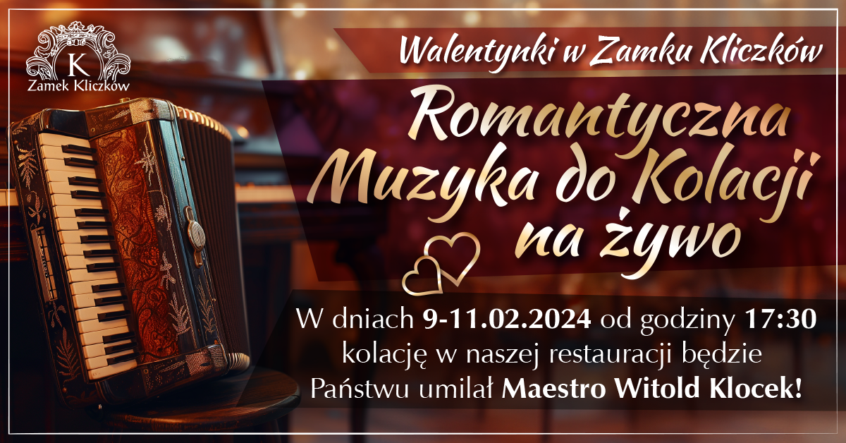 W dniach 9-11 lutego 2024 roku w urokliwej Sali Dworskiej odbędą się wyjątkowe występy na akordeonie, w wykonaniu Maestro Witolda Klocka. Przygotowany przez niego repertuar będzie składał się z utworów o romantycznym charakterze, zapewniając niezapomniane przeżycia muzyczne. Serdecznie zapraszamy każdego wieczora od godziny 17:30 na dwugodzinne występy, które stanowić będą doskonałą okazję do delektowania się muzyką i atmosferą święta zakochanych.