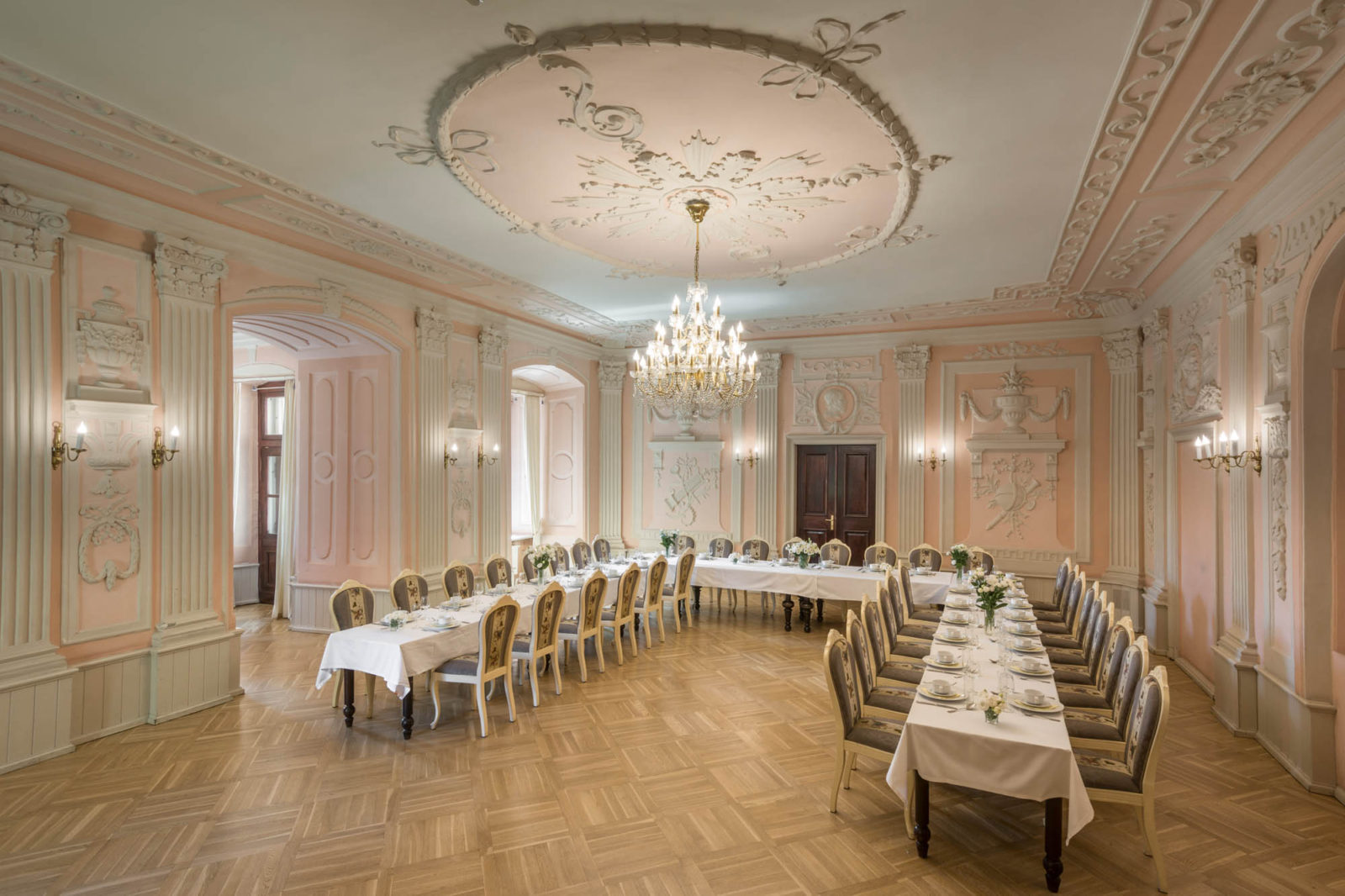 Sala Balowa – empirowa bladoróżowa i biała dekoracja ścian Sali Balowej i sufitu pochodzi z początku XIX w. Eleganckie wykończenie wnętrz idealnie pasuje do wytwornych przyjęć okolicznościowych.