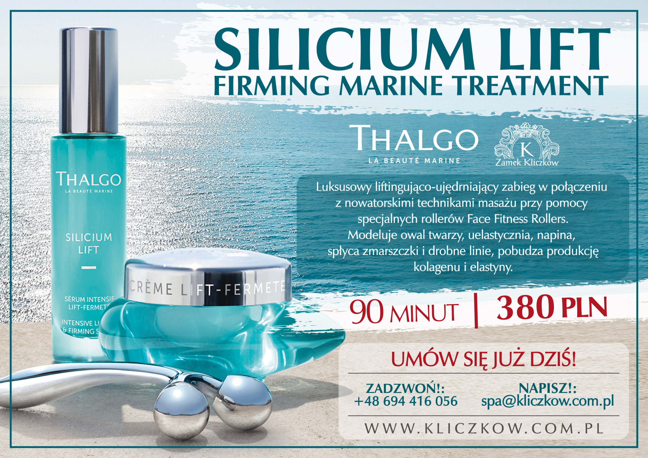 Pierwszy profesjonalny zabieg Thalgo inspirowany „Face Fitness”, który łączy w sobie przeciwstarzeniową moc krzemu i witaminy C z ekskluzywną techniką modelowania twarzy przy pomocy specjalnych rollerów Face Fitness Rollers. Luksusowy, liftingująco-ujędrniający zabieg, który wykracza poza klasyczną kosmetykę. Już po jednym zabiegu skóra może wygląda na wyraźnie odmłodzoną. Wysokoskoncentrowane składniki aktywne oraz nowatorskie techniki masażu zapewniają natychmiastowy efekt liftingu i wygładzenia skóry. W trakcie zabiegu aplikowane są dwie maski liftingująco-ujędrniająca z kwasem hialuronowym oraz modelująca Cryo-Lifting&Firming Mask. Zabieg modeluje owal twarzy, uelastycznia i napina skórę, spłyca zmarszczki i drobne linie, pobudza produkcję kolagenu i elastyny.