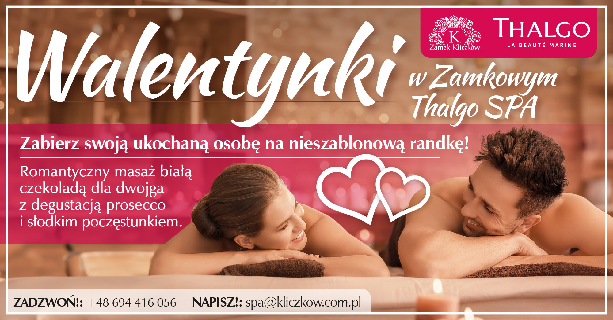 Skorzystaj ze specjalnej oferty walentynkowej w zamkowym Thalgo SPA. Zabierz swoją ukochaną osobę na nieszablonową randkę – zapraszamy na romantyczny masaż białą czekoladą dla dwojga, z degustacją prosecco oraz słodkim poczęstunkiem. Oferta obowiązuje od 1 do 29 lutego 2024.