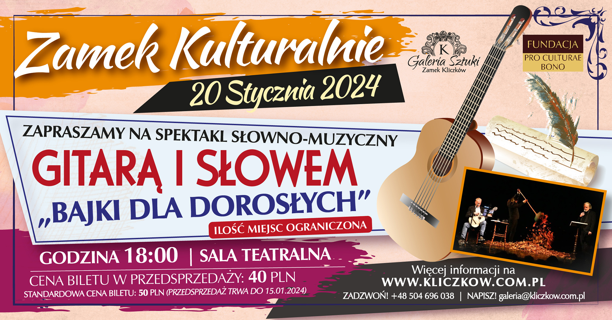 W dniu 20.01.2024 o godzinie 18:00 w Sali Dworskiej odbędzie się Spektakl Słowno-Muzyczny Gitarą i Słowem „Bajki dla dorosłych”. Zapraszamy serdecznie!